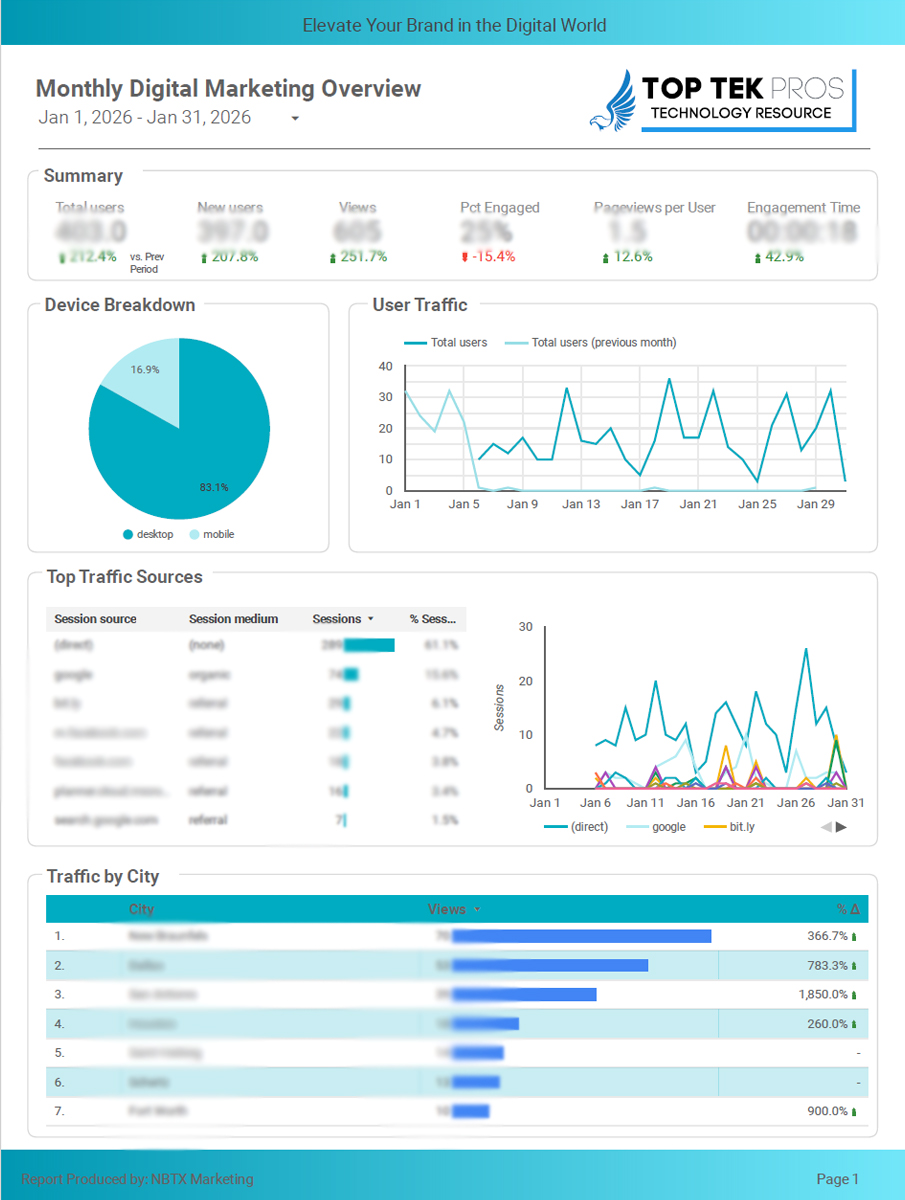 Each month, Top Tek Pros receives customized SEO performance reporting showing keyword ranking progress, organic traffic growth, and opportunities for continued improvement. This reporting helps guide strategy decisions and keeps growth measurable and consistent.